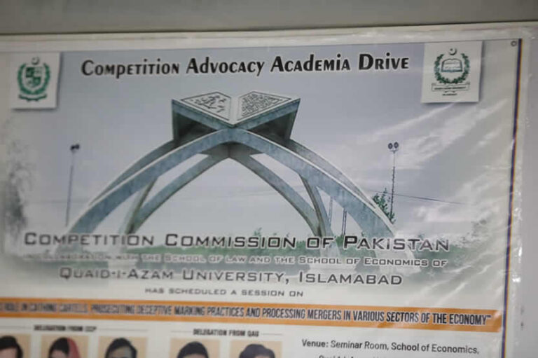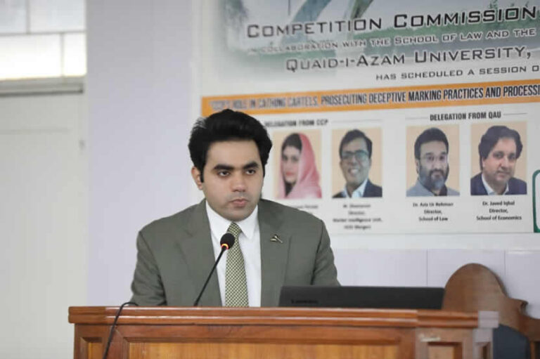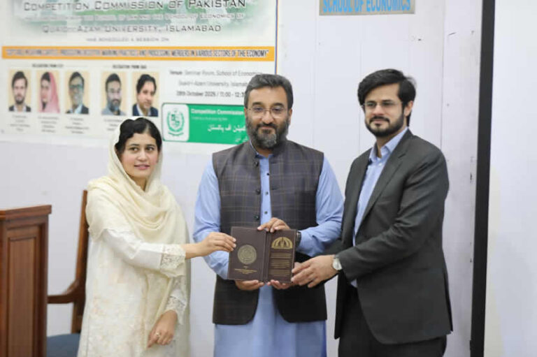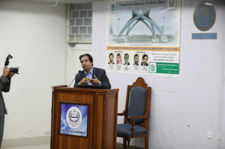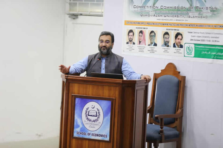 The Competition Commission of Pakistan (CCP), in collaboration with the School of Law and the School of Economics, Quaid-i-Azam University (QAU), organized a special session under its Competition Advocacy Academia Drive titled: “CCP’s Role in Catching Cartels, Prosecuting Deceptive Marketing Practices, and Processing Mergers in Various Sectors of the Economy.”